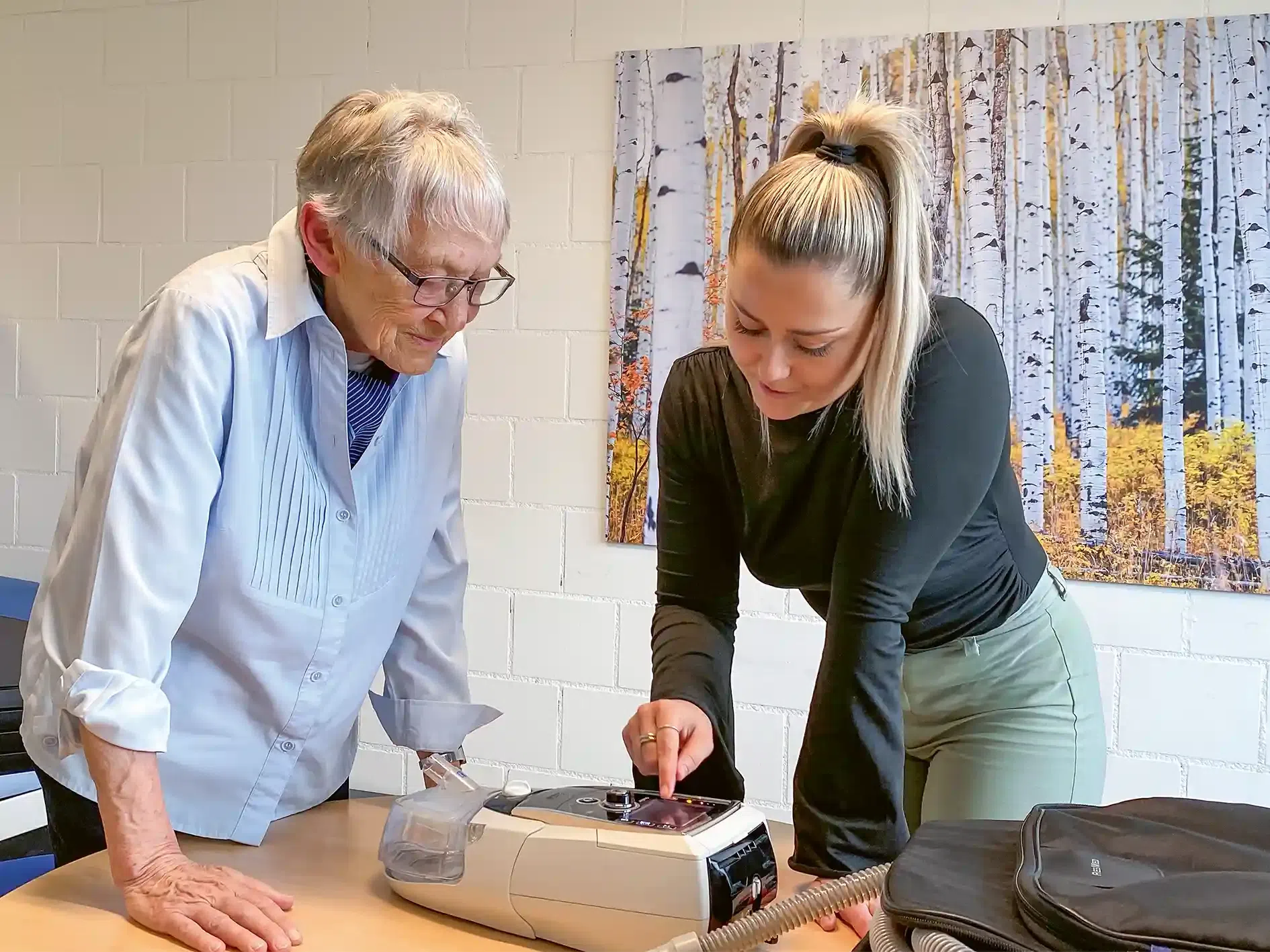 Photo: La collaboratrice de la Ligue pulmonaire Est explique à Lina Dürr le fonctionnement de l’appareil d’assistance ventilatoire de sa soeur.